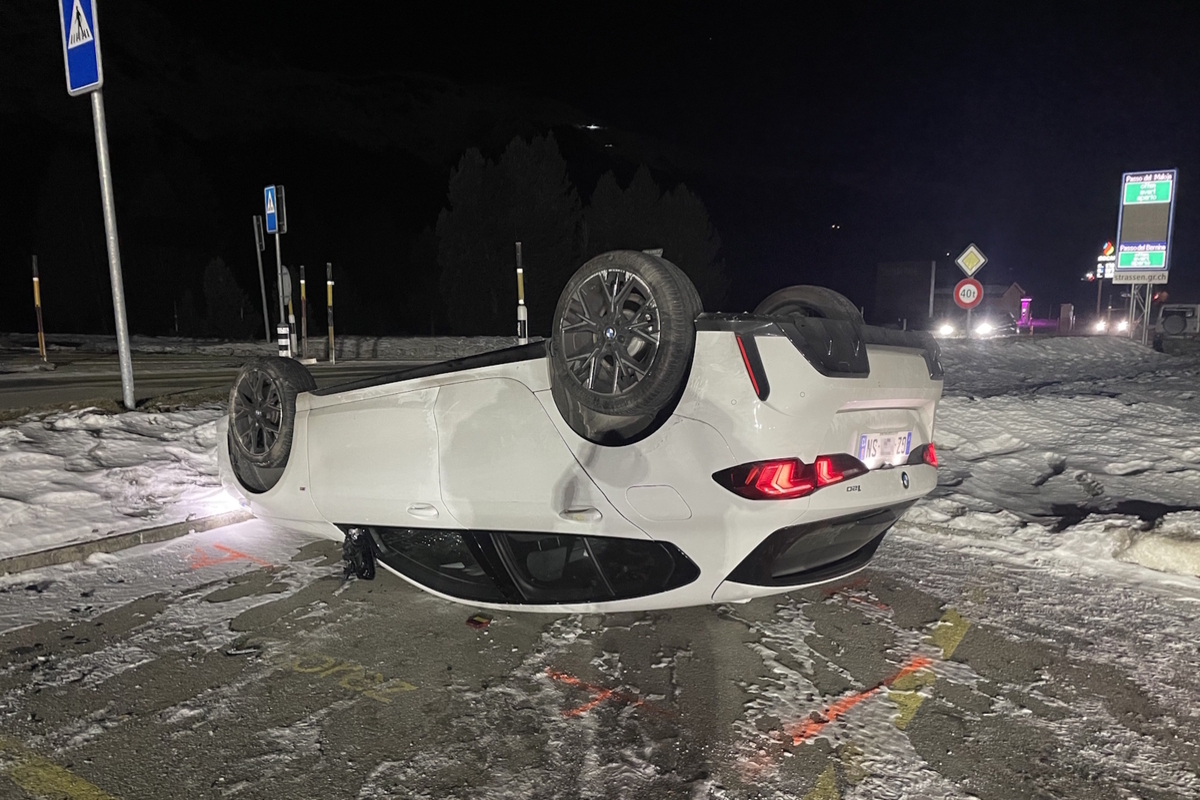 Beim Kreisel beim Campingplatz Silvaplana geriet das mit Sommerreifen ausgerüstete Fahrzeug ins Schleudern, prallte gegen den rechtsseitigen Randstein und überschlug sich.