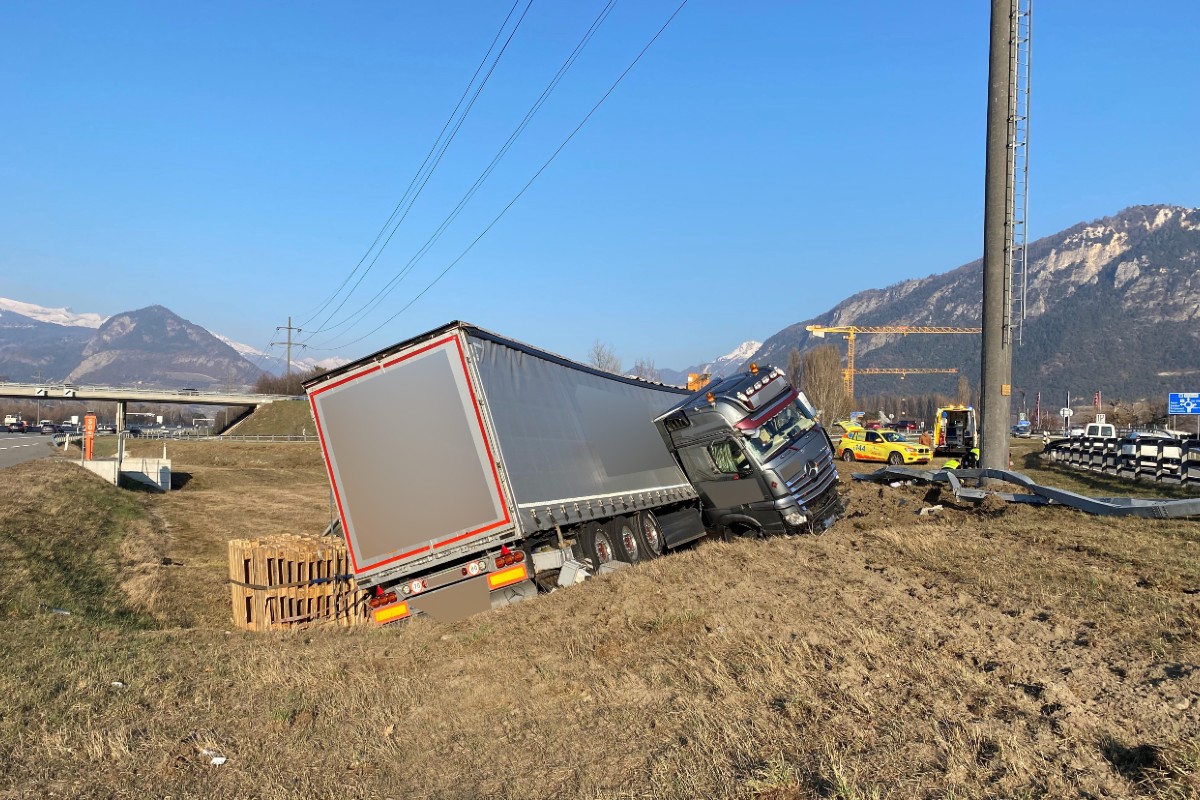 Der Unfall ereignete sich um 16:25 Uhr bei Sion. Der Lenker eines Lastwagens mit Anhänger fuhr auf der Autobahn A9 von Sitten in Richtung Siders. Ausgangs der Galerie von Champsec, kurz vor der Autobahnausfahrt Sitten Ost, geriet er mit seinem Lastwagen aus noch nicht geklärten Gründen an den rechten Strassenrand, prallte anschliessend gegen die Leitplanken und kam auf dem angrenzenden Grünstreifen zum Stillstand.