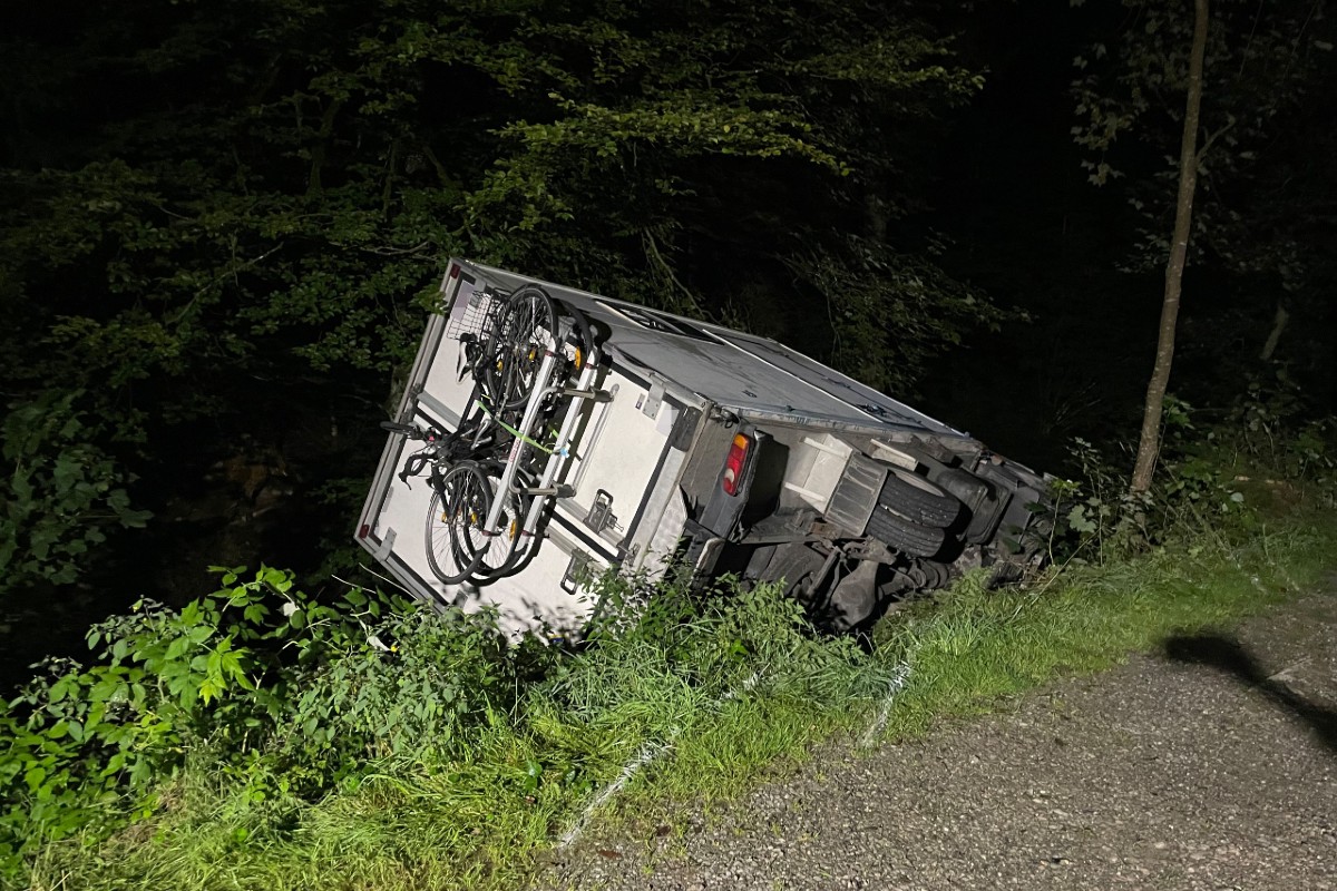 Am Donnerstag (31.08.2023) um 1 Uhr nachts ist an der St.Georgen-Strasse ein ungenügend gesichertes Fahrzeug von einem Kiesplatz in Richtung eines Baches gerollt. Bei einer Böschung kippte das Fahrzeug auf die linke Seite. Zwei Personen wurden leicht verletzt. Es entstand Sachschaden.
