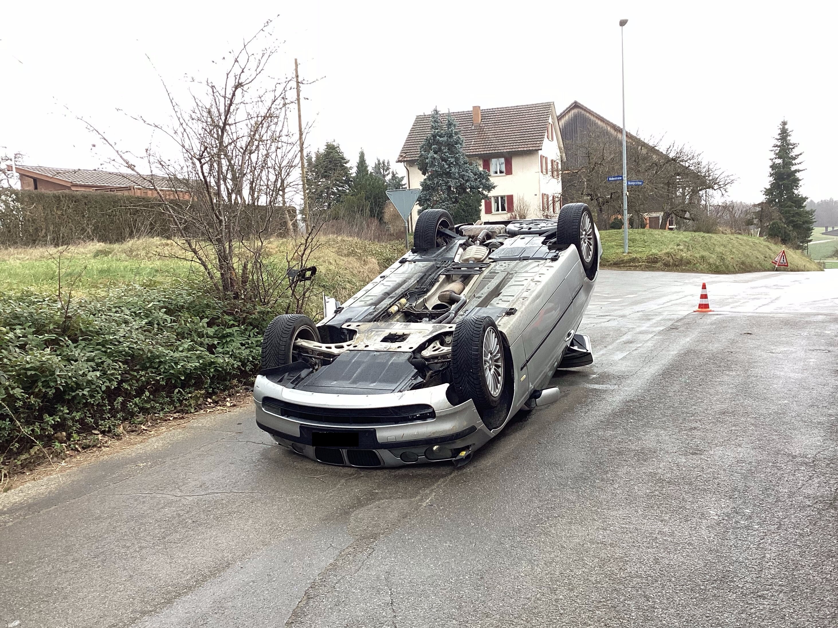Ein 26-jähriger Mann fuhr um 13.00 Uhr am frühen Donnerstagnachmittag (02.02.2023) mit einem Auto in der Stadt Schaffhausen von der Widlenstrasse nach rechts in die Büsingerstrasse ein. Zur gleichen Zeit fuhr eine unbekannte Frau in einem roten Auto auf der Büsingerstrasse in Richtung Stadt Schaffhausen. Nach Angaben des Autofahrers hupte die Frau, worauf er nach hinten schaute, das rote Auto bemerkte und in der Folge mit seinem Personenwagen über die Böschung am rechten Strassenrand gefahren sei, um dem roten Auto auszuweichen. In der Folge überschlug sich das Auto des Mannes und kam auf dem Fahrzeugdach zum Stillstand.