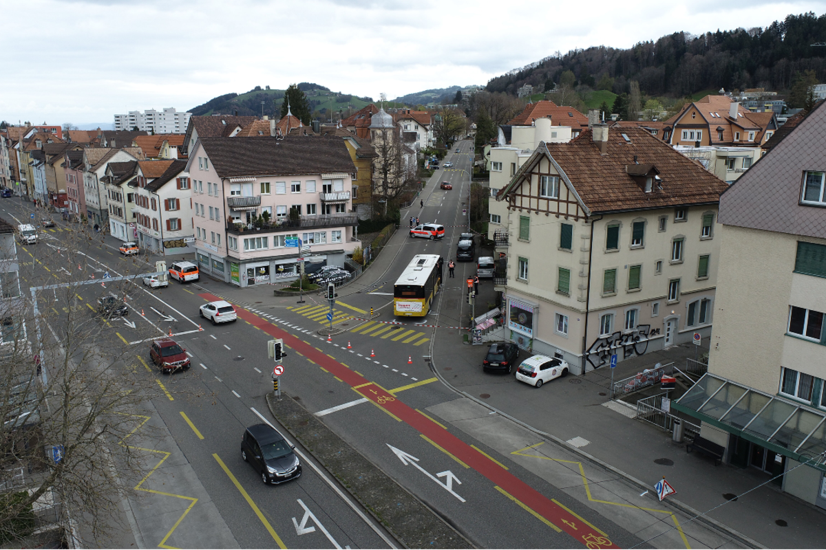 Am heutigen Donnerstagmittag (13.04.2023) kam es bei der Verzweigung Rorschacherstrasse/Rehetobelstrasse zu einem Unfall zwischen einer Fussgängerin und einem Postauto. Die Frau wurde schwer verletzt ins Krankenhaus gebracht.