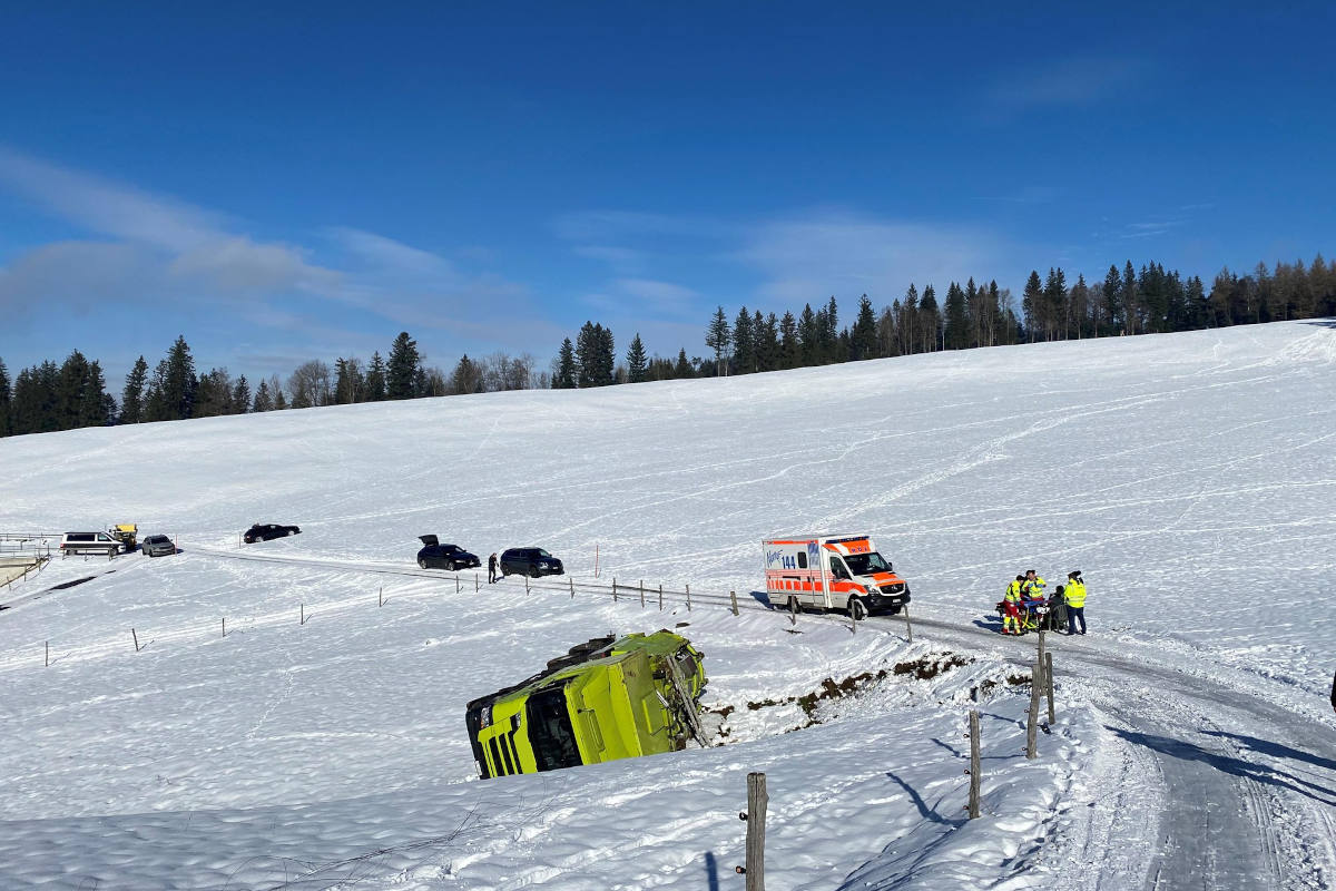 Der Unfall ereignete sich am Dienstag (31. Januar 2023), kurz vor 11:45 Uhr, auf dem Zugerberg. Ein 28-jähriger Chauffeur ist auf der schneebedeckten Bannholzstrasse mit seinem Gastro-Recyclinglastwagen ins Rutschen gekommen und rechts von der Fahrbahn abgekommen. Das Gefährt überschlug sich und kam rund 10 Meter von der Strasse entfernt im Wiesland auf der Seite liegend zum Stillstand.