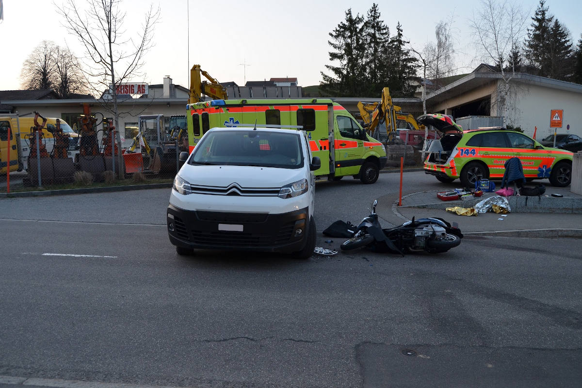 Durch den aufgebotenen Rettungsdienst wurde die Frau mit mittelschweren Verletzungen in ein Spital überführt. Der Fahrer des Lieferwagens blieb unverletzt. An beiden Fahrzeugen entstand Sachschaden von einigen Tausend Franken.