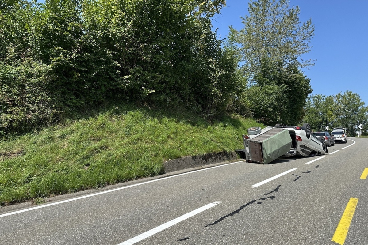 In der Folge überschlug sich die Fahrzeugkombination, wodurch der Personenwagen auf dem Dach, und der Anhänger auf der Seite liegend, auf der Fahrbahn zum Stillstand kamen.