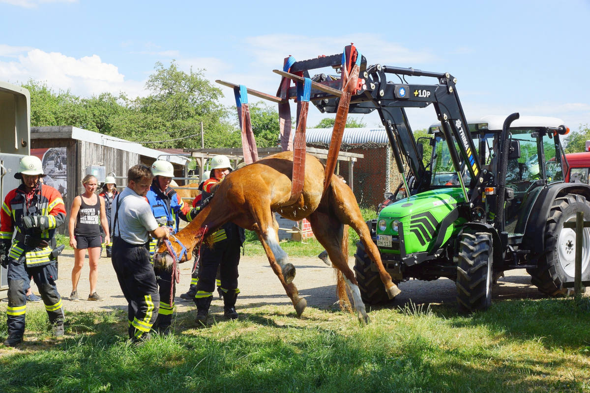 Neben der zuständigen Ortsteilfeuerwehr rückte auch die Kernstadtwehr mit einem Kranfahrzeug und Spezialausrüstung für die Rettung von Großtieren an. Während die Feuerwehr die technische Rettung vorbereitete, wurde das Pferd durch den tierärztlichen Notdienst medizinisch versorgt.
