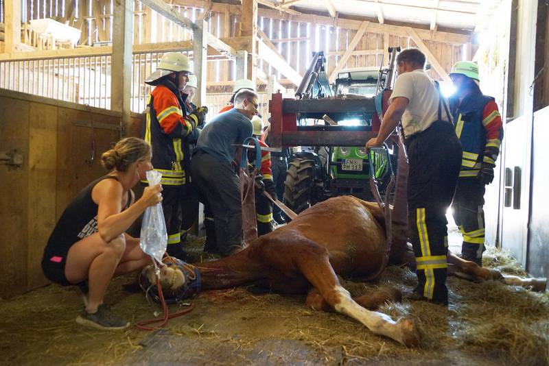Weil der Holsteiner Wallach im Inneren des Stalls lag, konnte das Kranfahrzeug aber nicht eingesetzt werden. Mit dem rasch organisierten Frontlader eines Feuerwehrangehörigen gelang es schließlich, das ehemalige Turnierpferd aus der Boxengasse zu hieven und auf eine schattige Wiese zu bringen. Dort wurde es stabilisiert und vom Tierarzt weiter behandelt.