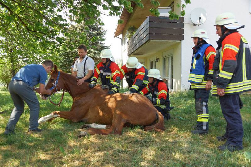 In der Stallung eines Pferdehofs im Ortsteil Deisendorf war ein Pferd gestürzt und konnte weder aus eigener Kraft aufstehen, noch mit Hilfe der anwesenden Reiterinnen und des Hofpersonals aufgerichtet werden. Durch die unnatürliche Lage in der engen Boxengasse drohten dem Tier Organschäden und Atemnot.