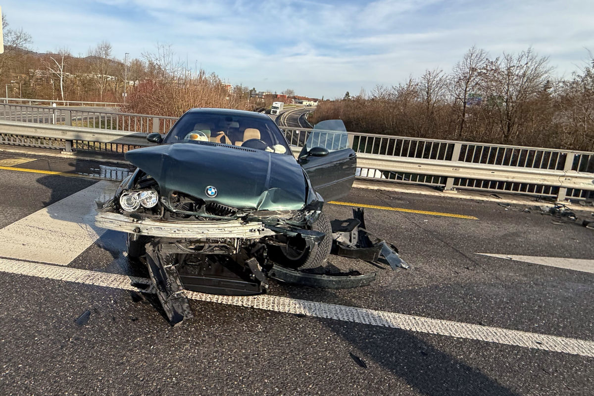 Das Heck des BMW brach aus und das Fahrzeug schleuderte gegen eine Leitplanke. (Bildquelle: Kantonspolizei Aargau)