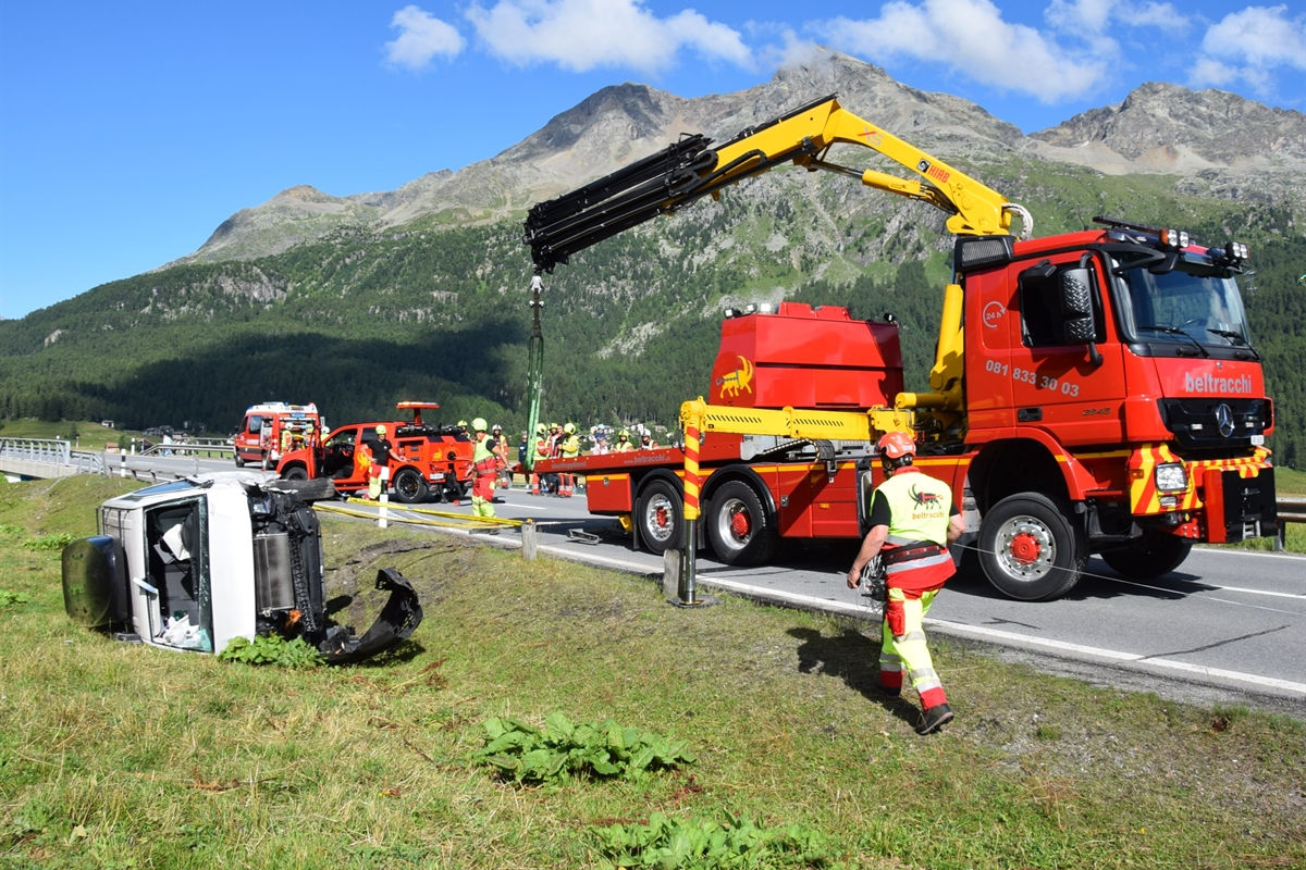 Am Montag, 21. Juli 2025, kam es auf der Malojastrasse H3 bei Silvaplana zu einer Kollision zwischen einem Lieferwagen und einem Kleinbus. Beide Fahrzeuge wurden total beschädigt. Fünf Personen, darunter zwei Kinder, erlitten Verletzungen. Die Strasse war rund zwei Stunden gesperrt.