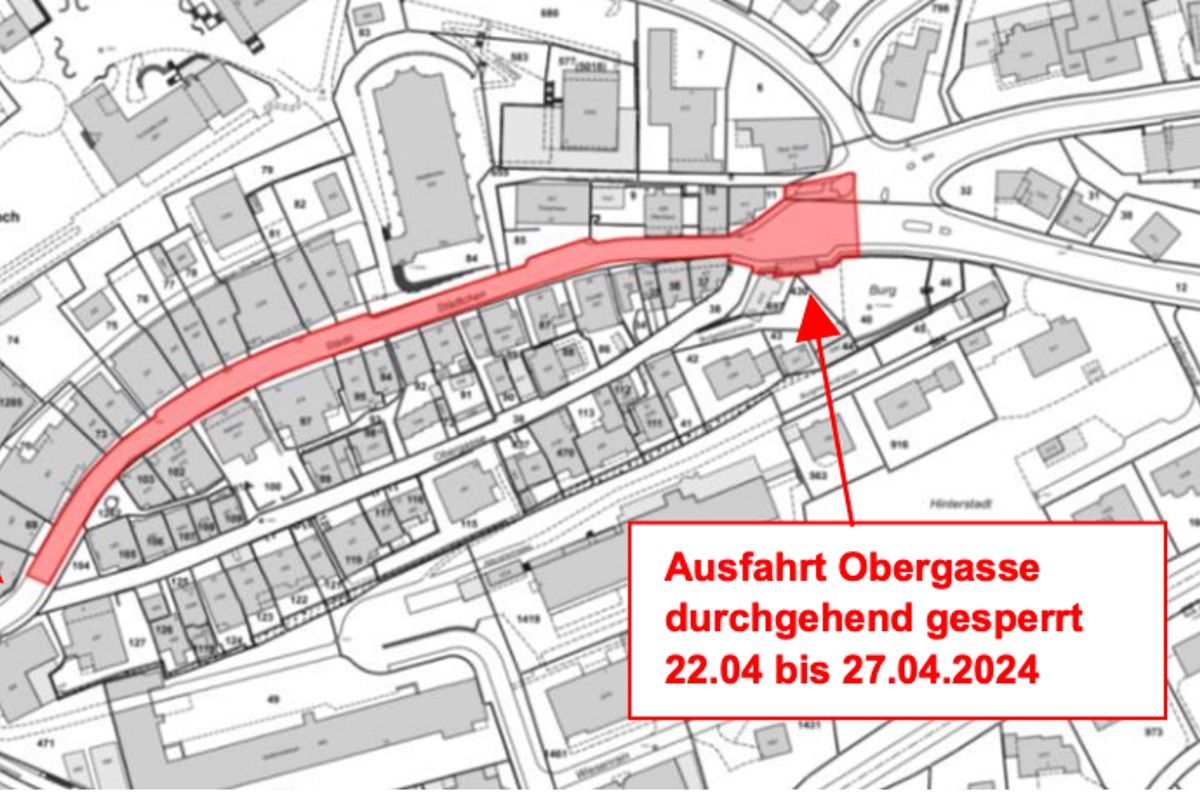 Ab Montag, 22. April bis Freitag, 26. April 2024 wird das Städtchen im Abschnitt Ochsen- bis Rösslikreuzung während der Nacht, jeweils zwischen 19.00 Uhr abends bis 05.00 Uhr morgens, für den Verkehr vollständig gesperrt.