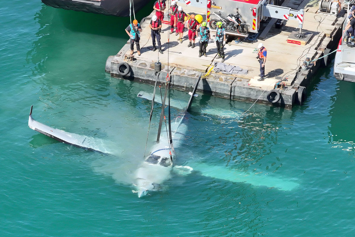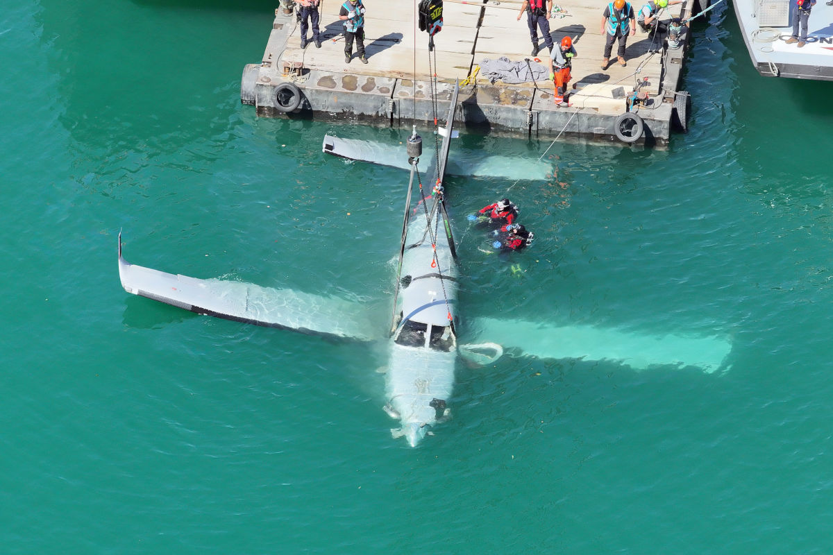 Mit Hilfe einer Hebevorrichtung wurde es aus dem Wasser gehoben, auf ein Transportschiff verladen und anschliessend an Land gebracht. Dort wurde der restliche Treibstoff abgepumpt und das Flugzeug wird für den Weitertransport vorbereitet.