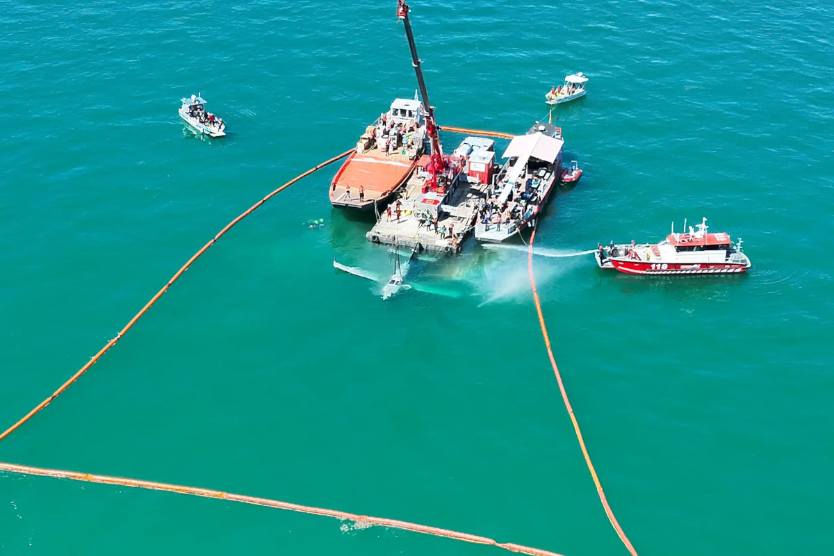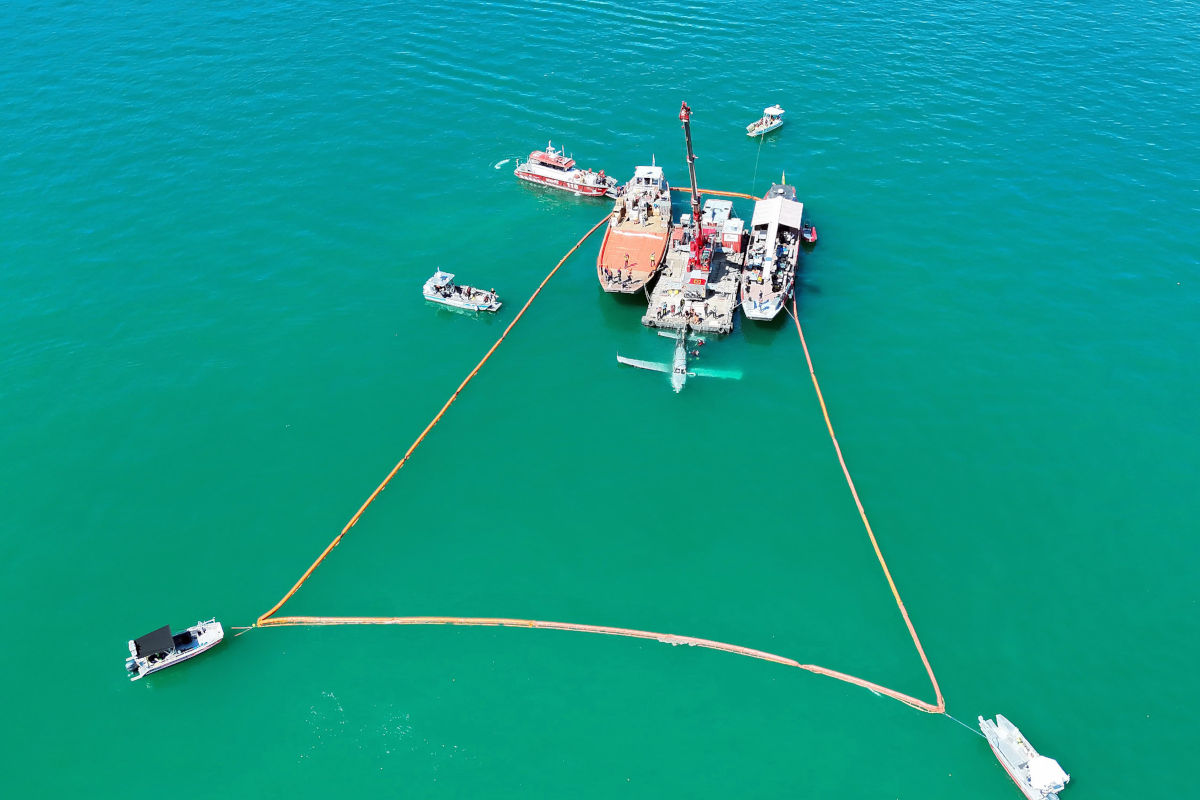 Nach einer sorgfältigen Lagebeurteilung gelang es in einem ersten Schritt am Flugzeug Befestigungspunkte für die Bergung anzubringen. Diese Arbeiten gestalteten sich aufgrund der Tiefe von über 100 Metern und den schwierigen Bedingungen auf dem Seegrund als besonders anspruchsvoll.
