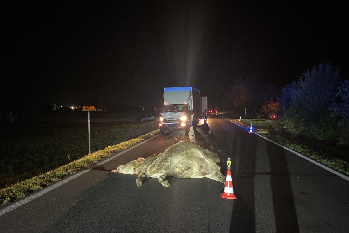 In der Nacht von Montag auf Dienstag kollidierte ein Lieferwagenfahrer mit einer Kuh und einem Kalb. Durch die Kollision verstarben beide Tiere noch auf der Unfallstelle. Der Lenker blieb unverletzt. Am Fahrzeug entstand erheblicher Sachschaden.