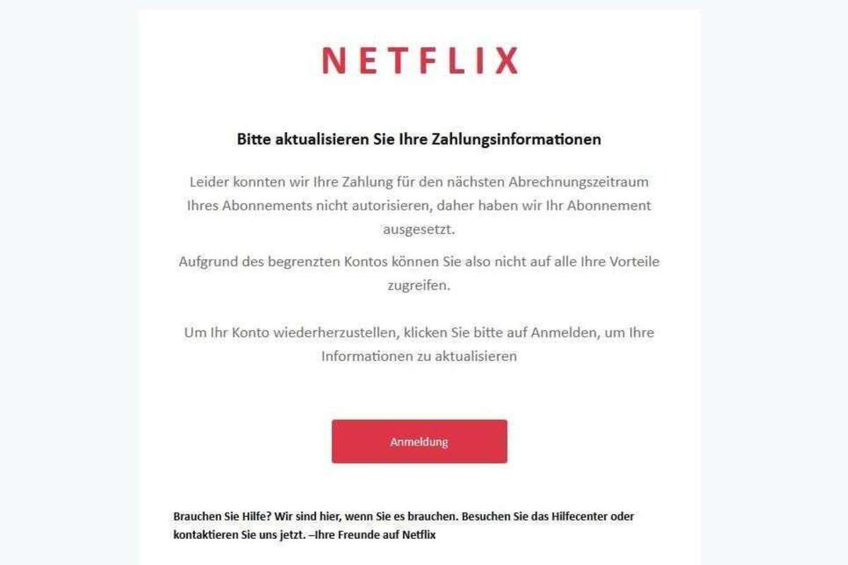 Betrüger verschicken E-Mails im angeblichen Namen von Netflix und gaukeln den potentiellen Opfern vor, dass die Zahlung für den nächsten Abrechnungszeitraum des Netflix-Abonnements nicht autorisiert werden konnte. Das Ziel dieser Betrugsmasche ist an die Login- sowie Kreditkartendaten der Opfer zu gelangen.