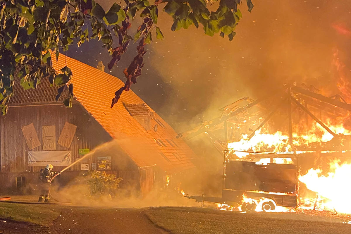 Der Kantonspolizei Bern wurde am Donnerstag, 21. Juli 2022, kurz nach 4.50 Uhr, gemeldet, dass ein Wagenschopf an der unteren Tanne in Weier im Emmental (Gemeinde Sumiswald) brenne. Der Schopf stand bei Eintreffen der Einsatzkräfte bereits in Vollbrand. Die rund 75 Angehörigen der Feuerwehren Sumiswald und Langnau nahmen umgehend die Löscharbeiten auf und konnten das Feuer rasch unter Kontrolle bringen. Ein Übergreifen auf ein angrenzendes Bauernhaus konnte verhindert werden, eine Gebäudeseite wurde durch das Feuer jedoch angesengt. Der Wagenschopf brannte komplett nieder. Eine Brandwache wird bis Freitagmorgen gestellt.