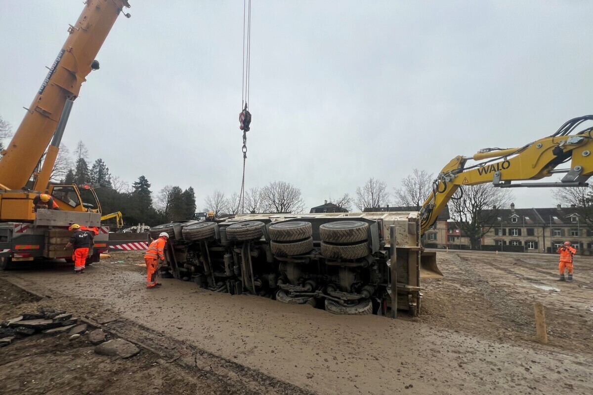 Am Freitagmittag, 9. Februar 2024, kippte auf einer Baustelle in Winterthur ein Lastwagen um. Verletzt wurde niemand. Die Bergungsarbeiten dauern an.