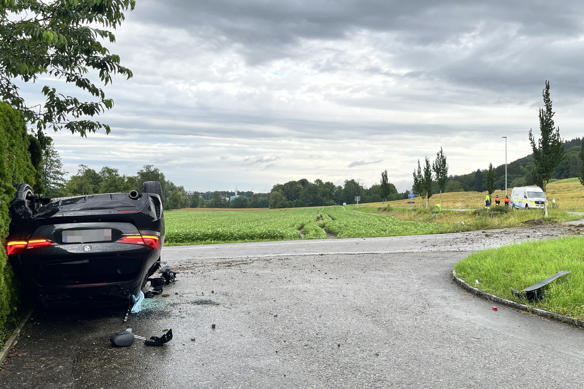 Ein schwarzer BMW ist am frühen Morgen von der Strasse abgekommen und auf dem Dach gelandet. Der Lenker wurde verletzt. Der hohe Alkoholwert dürfte zum Unfallgeschehen beigetragen haben.