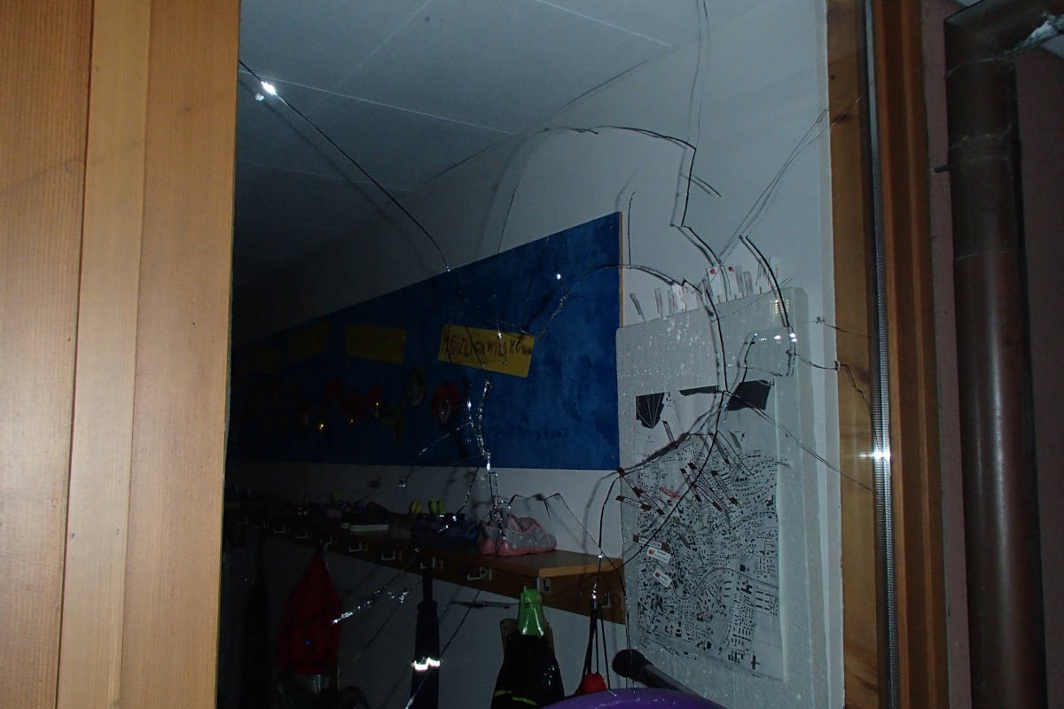 eine Scheibe des Kindergartens eingeschlagen. Weiter