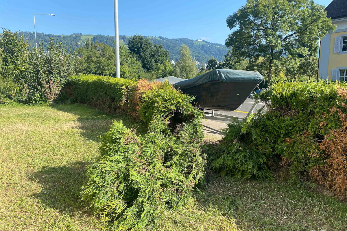 Verletzt wurde niemand. An der Hecke, der Rasenfläche und dem Boot entstand jedoch Sachschaden. Die genauen Umstände des Vorfalls sind Gegenstand weiterer Untersuchungen.